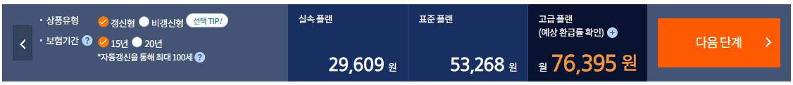 자동갱신형 선택 시 초회 보험료 저렴. 15/20년마다 자동갱신하여 최대 100세까지 보장. 15/20년 동안 보험료 변동 없음(갱신 시 보험료 인상 가능).