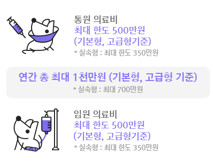 | 입원의료비보장 | 연 350만원 한도 1일당 1만원 공제 후 50% 보상 |