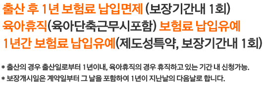 둘째, 출산 후 5년 간 중대질병 진단비가 2배로 강화 보장되며, 특히 출산과 육아 휴직 기간 동안 보험료 납입이 유예됩니다.