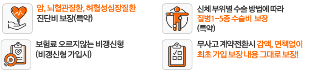 혈압이나 당뇨가 있어도 간편심사를 통과하면 3대 질환진단비와 4대 유사암에 대한 보장을 특약으로 준비할 수 있습니다. 단, 가입 후 1년 미만일 경우 보험금은 50%만 지급됩니다. 더불어, 질병으로 인한 수술비와 중환자실 입원일당도 특약 가입으로 보장받으실 수 있습니다.