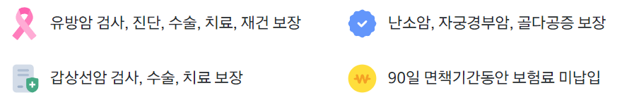 여성분들을 위한 보험입니다. 유방암, 난소암, 자궁경부암, 골다공증, 갑상선암을 보장해주니 자세히 확인하시고 자신에게 적합한 보험이라고 생각하시면 보험가입에 참고해보시길 바랍니다!