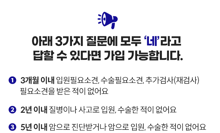 간편 심사 가입 가능: 병력이 있거나 나이가 많아도 간편 심사를 통과하면 가입할 수 있습니다. 가입 가능 여부는 3가지 질문에 대한 답변을 통해 결정됩니다.