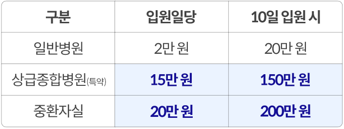 입원비 보장: 가입 첫날부터 보장이 시작되며, 입원 첫날부터 보장받을 수 있습니다. 병원 유형에 따라 입원 일당이 다르게 지급됩니다. 예를 들어, 일반병원에서는 2만원, 상급종합병원에서는 15만원, 중환자실에서는 20만원의 입원 일당이 지급됩니다. 특정 조건을 만족하는 경우, 보장 금액의 50%를 지급받을 수 있습니다.