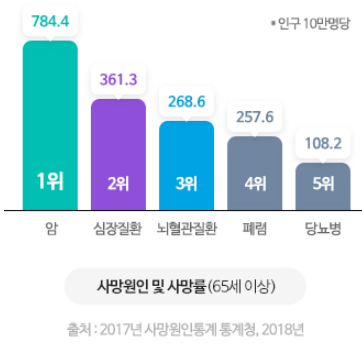 보험은 65세 이상의 어르신들에게 중요한 사망 원인인 암, 심장질환, 뇌혈관질환 등에 대해 보장하며, 이러한 질병들은 한국에서 65세 이상 인구의 주요 사망 원인으로 꼽힙니다. 예를 들어, 2017년 통계에 따르면 암 사망률이 10만 명당 784.4명으로 가장 높았습니다.
