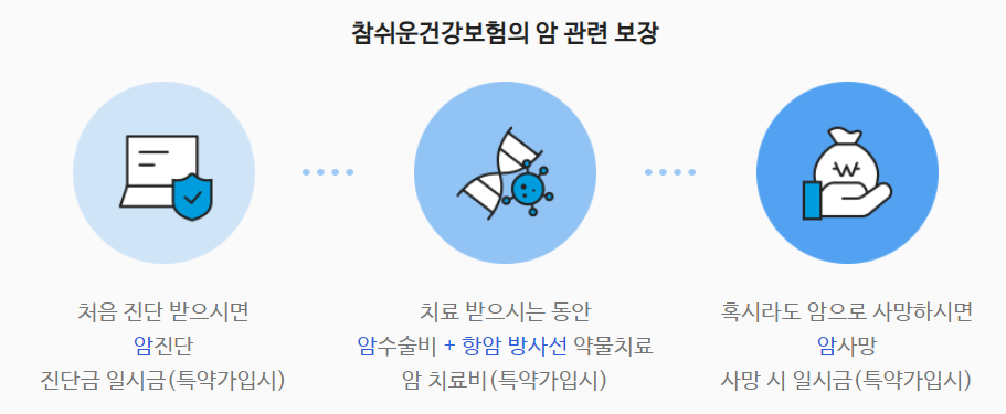 암 관련 보장도 제공합니다. 암 진단 시 일시금, 암 수술비, 항암 방사선 약물치료비, 그리고 암으로 인한 사망 시에도 일시금을 지급합니다(특약 가입시).