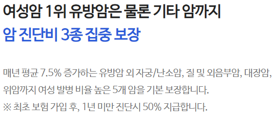 여성 발병 비율이 높은 5개 암을 기본적으로 보장해줍니다. 자세한 내용은 아래 글을 확인해주세요!