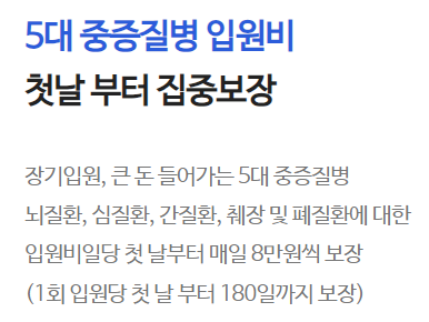 5대 중증질병 입원비 보장: 뇌질환, 심질환, 간질환, 췌장 및 폐질환으로 인한 입원 시, 입원 첫날부터 매일 80,000원씩 보장합니다(1회 입원당 최대 180일)