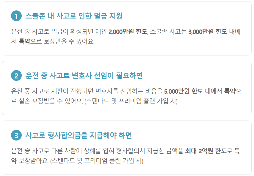 스쿨존 내 사고 벌금 지원: 운전 중 사고로 인한 벌금이 확정되면, 대인 최대 2,000만원, 스쿨존 사고는 최대 3,000만원까지 보장