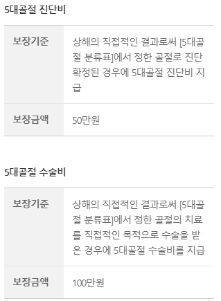 5대골절 진단비 및 수술비, 1~5종 상해수술비: 특정 골절 및 수술에 대해 지정된 금액을 지급합니다.