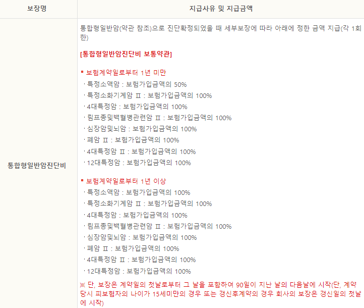 | 통합형일반암진단비 | 통합형일반암(약관 참조)으로 진단확정되었을 때 세부보장에 따라 아래에 정한 금액 지급(각 1회한) [통합형일반암진단비 보통약관] 보험계약일로부터 1년 미만 특정소액암 : 보험가입금액의 50% 특정소화기계암 Ⅱ : 보험가입금액의 100% 4대특정암 : 보험가입금액의 100% 림프종및백혈병관련암 Ⅱ : 보험가입금액의 100% 심장암및뇌암 : 보험가입금액의 100% 폐암 Ⅱ : 보험가입금액의 100% 4대특정암 Ⅱ : 보험가입금액의 100% 12대특정암 : 보험가입금액의 100% 보험계약일로부터 1년 이상 특정소액암 : 보험가입금액의 100% 특정소화기계암 Ⅱ : 보험가입금액의 100% 4대특정암 : 보험가입금액의 100% 림프종및백혈병관련암 Ⅱ : 보험가입금액의 100% 심장암및뇌암 : 보험가입금액의 100% 폐암 Ⅱ : 보험가입금액의 100% 4대특정암 Ⅱ : 보험가입금액의 100% 12대특정암 : 보험가입금액의 100% ※ 단, 보장은 계약일의 첫날로부터 그 날을 포함하여 90일이 지난 날의 다음날에 시작(단, 계약당시 피보험자의 나이가 15세미만의 경우 또는 갱신후계약의 경우 회사의 보장은 갱신일의 첫날에 시작) |