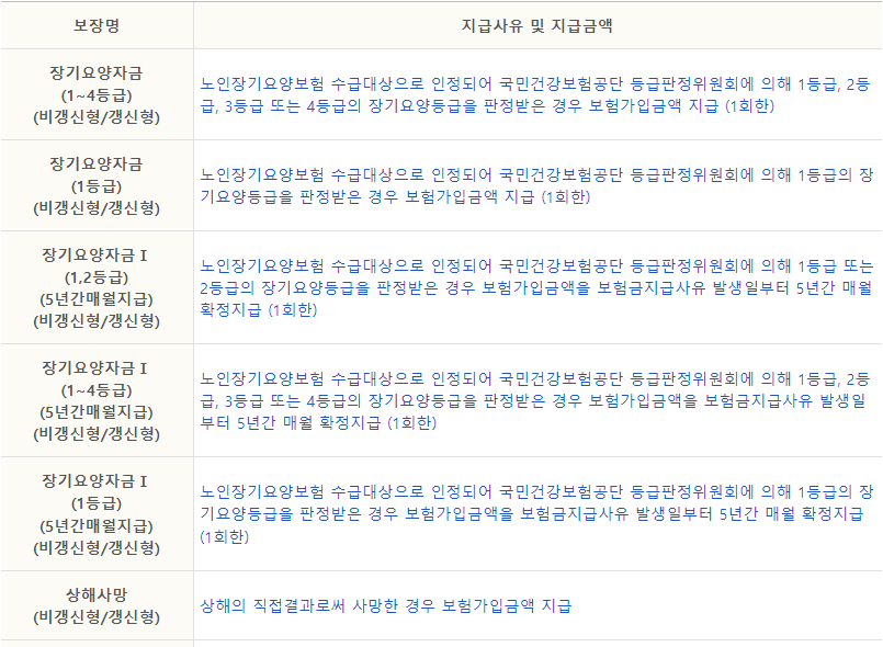 노인장기요양보험 수급대상으로 인정되어 국민건강보험공단 등급판정위원회에 의해 1등급 또는 2등급의 장기요양등급을 판정받은 경우 보험가입금액 지급 (1회한) |